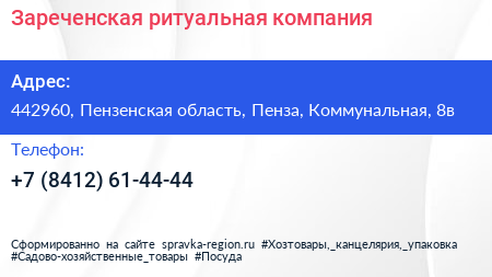 Зареченская ритуальная компания по адресу 442960, Пензенская область, Пенза, Коммунальная, 8в в дальнейшем Организация, размещена в следующих категориях: