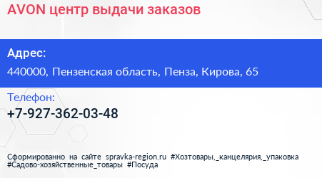 AVON, центр выдачи заказов по адресу 440000, Пензенская область, Пенза, Кирова, 65 в дальнейшем Организация, размещена в следующих категориях: