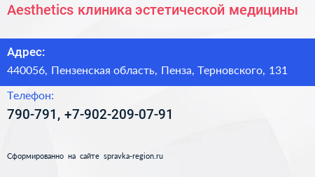 Aesthetics, клиника эстетической медицины по адресу 440056, Пензенская область, Пенза, Терновского, 131 в дальнейшем Организация, размещена в следующих категориях: