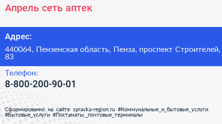 Апрель, сеть аптек по адресу 440064, Пензенская область, Пенза, проспект Строителей, 83 в дальнейшем Организация, размещена в следующих категориях: