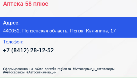 Аптека 58 плюс по адресу 440052, Пензенская область, Пенза, Калинина, 17 в дальнейшем Организация, размещена в следующих категориях: