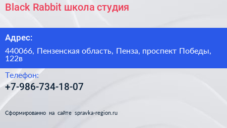 Black Rabbit, школа-студия по адресу 440066, Пензенская область, Пенза, проспект Победы, 122в в дальнейшем Организация, размещена в следующих категориях: