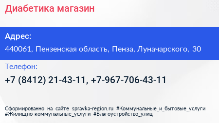 Диабетика, магазин по адресу 440061, Пензенская область, Пенза, Луначарского, 30 в дальнейшем Организация, размещена в следующих категориях:
