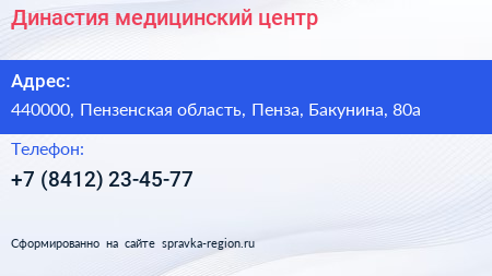 Династия, медицинский центр по адресу 440000, Пензенская область, Пенза, Бакунина, 80а в дальнейшем Организация, размещена в следующих категориях: