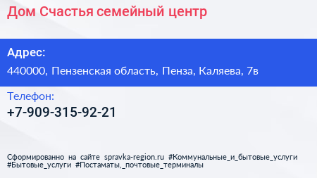 Дом Счастья, семейный центр по адресу 440000, Пензенская область, Пенза, Каляева, 7в в дальнейшем Организация, размещена в следующих категориях:
