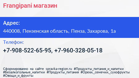 Frangipani, магазин по адресу 440008, Пензенская область, Пенза, Захарова, 1а в дальнейшем Организация, размещена в следующих категориях:
