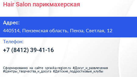 Hair Salon, парикмахерская по адресу 440514, Пензенская область, Пенза, Светлая, 12 в дальнейшем Организация, размещена в следующих категориях: