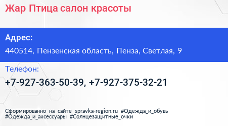 Жар-Птица, салон красоты по адресу 440514, Пензенская область, Пенза, Светлая, 9 в дальнейшем Организация, размещена в следующих категориях: