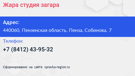 Жара, студия загара по адресу 440060, Пензенская область, Пенза, Собинова, 7 в дальнейшем Организация, размещена в следующих категориях: