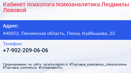 Кабинет психолога-психоаналитика Людмилы Левовой по адресу 440052, Пензенская область, Пенза, Куйбышева, 23 в дальнейшем Организация, размещена в следующих категориях:
