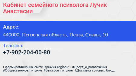 Кабинет семейного психолога Лучик Анастасии по адресу 440000, Пензенская область, Пенза, Славы, 10 в дальнейшем Организация, размещена в следующих категориях: