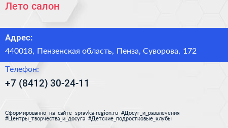 Лето, салон по адресу 440018, Пензенская область, Пенза, Суворова, 172 в дальнейшем Организация, размещена в следующих категориях: