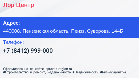 Лор-Центр по адресу 440008, Пензенская область, Пенза, Суворова, 144Б в дальнейшем Организация, размещена в следующих категориях: