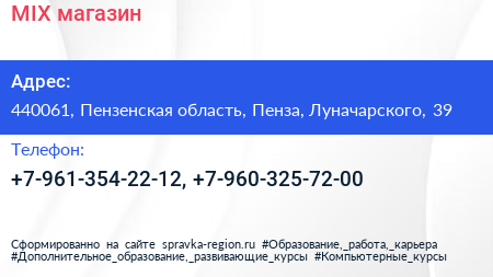 MIX, магазин по адресу 440061, Пензенская область, Пенза, Луначарского, 39 в дальнейшем Организация, размещена в следующих категориях: