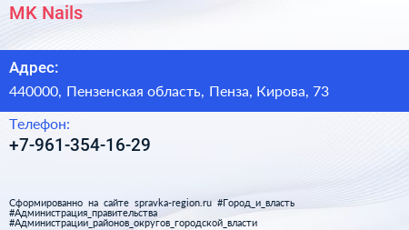 MK Nails по адресу 440000, Пензенская область, Пенза, Кирова, 73 в дальнейшем Организация, размещена в следующих категориях: