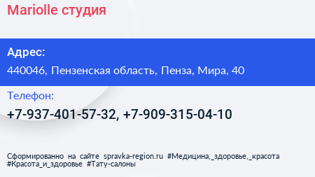 Mariolle, студия по адресу 440046, Пензенская область, Пенза, Мира, 40 в дальнейшем Организация, размещена в следующих категориях: