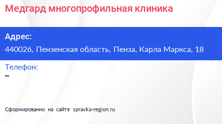 Медгард, многопрофильная клиника по адресу 440026, Пензенская область, Пенза, Карла Маркса, 18 в дальнейшем Организация, размещена в следующих категориях: