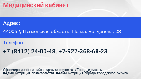 Медицинский кабинет по адресу 440052, Пензенская область, Пенза, Богданова, 38 в дальнейшем Организация, размещена в следующих категориях: