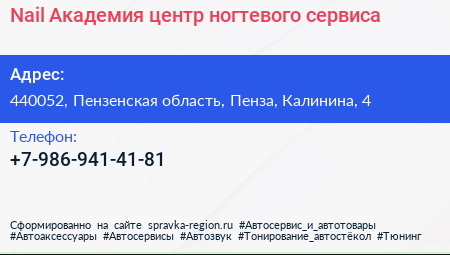 Nail Академия, центр ногтевого сервиса по адресу 440052, Пензенская область, Пенза, Калинина, 4 в дальнейшем Организация, размещена в следующих категориях: