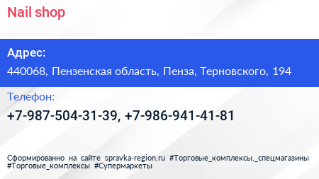 Nail shop по адресу 440068, Пензенская область, Пенза, Терновского, 194 в дальнейшем Организация, размещена в следующих категориях: