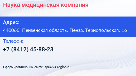 Наука, медицинская компания по адресу 440066, Пензенская область, Пенза, Тернопольская, 16 в дальнейшем Организация, размещена в следующих категориях: