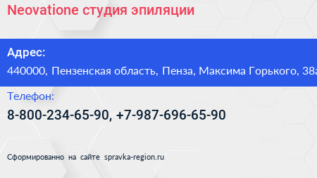 Neovatione, студия эпиляции по адресу 440000, Пензенская область, Пенза, Максима Горького, 38а в дальнейшем Организация, размещена в следующих категориях: