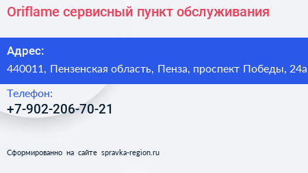 Oriflame, сервисный пункт обслуживания по адресу 440011, Пензенская область, Пенза, проспект Победы, 24а в дальнейшем Организация, размещена в следующих категориях: