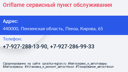 Oriflame, сервисный пункт обслуживания по адресу 440000, Пензенская область, Пенза, Кирова, 65 в дальнейшем Организация, размещена в следующих категориях: