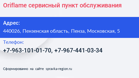 Oriflame, сервисный пункт обслуживания по адресу 440026, Пензенская область, Пенза, Московская, 5 в дальнейшем Организация, размещена в следующих категориях: