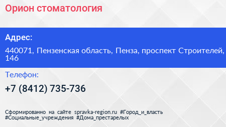Орион, стоматология по адресу 440071, Пензенская область, Пенза, проспект Строителей, 146 в дальнейшем Организация, размещена в следующих категориях: