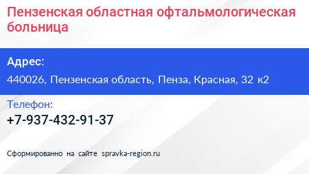 Пензенская областная офтальмологическая больница по адресу 440026, Пензенская область, Пенза, Красная, 32 к2 в дальнейшем Организация, размещена в следующих категориях: