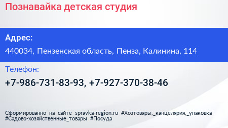 Познавайка, детская студия по адресу 440034, Пензенская область, Пенза, Калинина, 114 в дальнейшем Организация, размещена в следующих категориях: