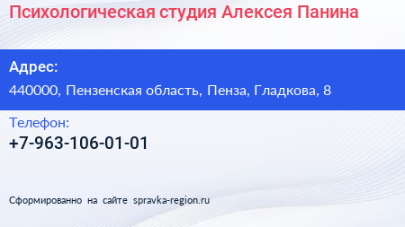 Психологическая студия Алексея Панина по адресу 440000, Пензенская область, Пенза, Гладкова, 8 в дальнейшем Организация, размещена в следующих категориях: