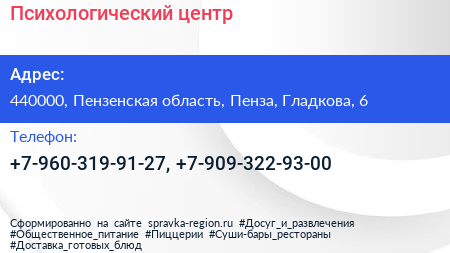 Психологический центр по адресу 440000, Пензенская область, Пенза, Гладкова, 6 в дальнейшем Организация, размещена в следующих категориях: