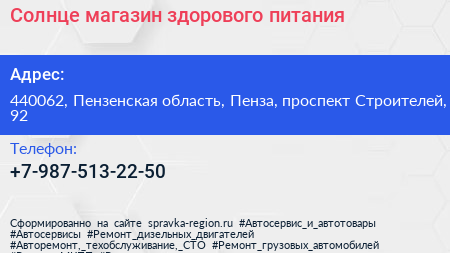 Солнце, магазин здорового питания по адресу 440062, Пензенская область, Пенза, проспект Строителей, 92 в дальнейшем Организация, размещена в следующих категориях: