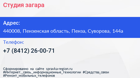 Студия загара по адресу 440008, Пензенская область, Пенза, Суворова, 144а в дальнейшем Организация, размещена в следующих категориях: