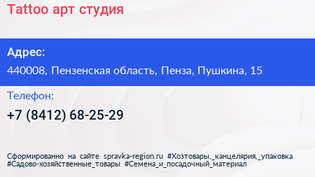 Tattoo, арт-студия по адресу 440008, Пензенская область, Пенза, Пушкина, 15 в дальнейшем Организация, размещена в следующих категориях: