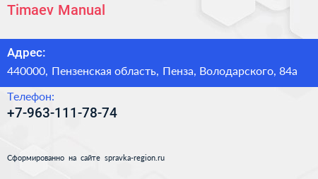 Timaev Manual по адресу 440000, Пензенская область, Пенза, Володарского, 84а в дальнейшем Организация, размещена в следующих категориях: