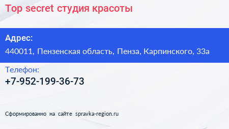 Top secret, студия красоты по адресу 440011, Пензенская область, Пенза, Карпинского, 33а в дальнейшем Организация, размещена в следующих категориях: