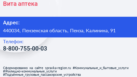 Вита, аптека по адресу 440034, Пензенская область, Пенза, Калинина, 91 в дальнейшем Организация, размещена в следующих категориях: