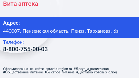 Вита, аптека по адресу 440007, Пензенская область, Пенза, Тарханова, 6а в дальнейшем Организация, размещена в следующих категориях: