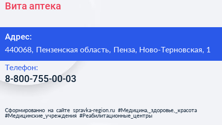 Вита, аптека по адресу 440068, Пензенская область, Пенза, Ново-Терновская, 1 в дальнейшем Организация, размещена в следующих категориях: