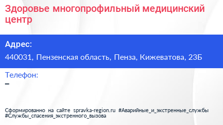 Здоровье, многопрофильный медицинский центр по адресу 440031, Пензенская область, Пенза, Кижеватова, 23Б в дальнейшем Организация, размещена в следующих категориях: