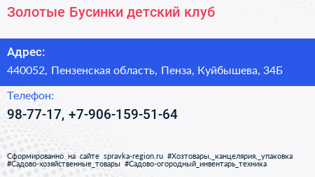 Золотые Бусинки, детский клуб по адресу 440052, Пензенская область, Пенза, Куйбышева, 34Б в дальнейшем Организация, размещена в следующих категориях: