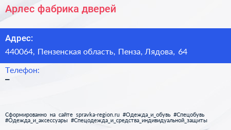 Арлес, фабрика дверей по адресу 440064, Пензенская область, Пенза, Лядова, 64 в дальнейшем Организация, размещена в следующих категориях: