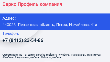 Барко Профиль, компания по адресу 440023, Пензенская область, Пенза, Измайлова, 41а в дальнейшем Организация, размещена в следующих категориях: