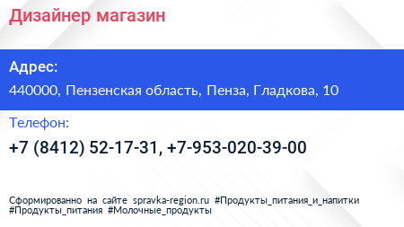 Дизайнер, магазин по адресу 440000, Пензенская область, Пенза, Гладкова, 10 в дальнейшем Организация, размещена в следующих категориях: