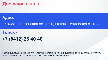 Дверянин, салон по адресу 440068, Пензенская область, Пенза, Терновского, 183 в дальнейшем Организация, размещена в следующих категориях: