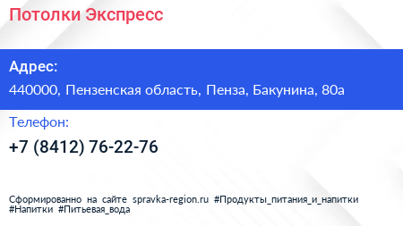 Потолки Экспресс по адресу 440000, Пензенская область, Пенза, Бакунина, 80а в дальнейшем Организация, размещена в следующих категориях: