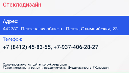 Стеклодизайн по адресу 442780, Пензенская область, Пенза, Олимпийская, 23 в дальнейшем Организация, размещена в следующих категориях:
